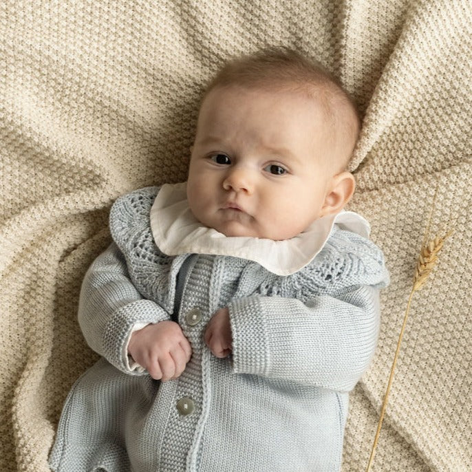 Chaleco tejido de hilo algodón hipoalergénico color celeste grisáceo, con detalle cuello a crochet. Perfecto para todas las temporadas, modelo abierto con botones concha perla. Diseño y confección nacional. Se puede lavar en la lavadora con función delicado o a mano.