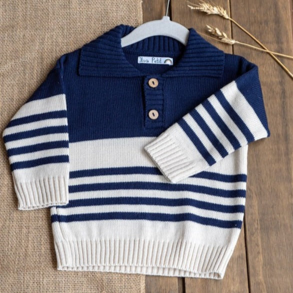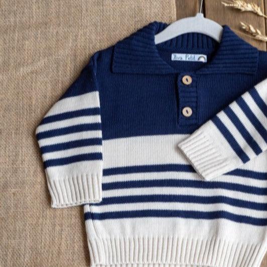 Chaleco tejido de lana algodón hipoalergénico, perfecto para esta temporada de otoño- invierno. Azul con rayas beige. Con delicados botones de madera. Diseño y confección nacional. Modo de lavado: Lavadora opción delicada (agua fría) o a mano.