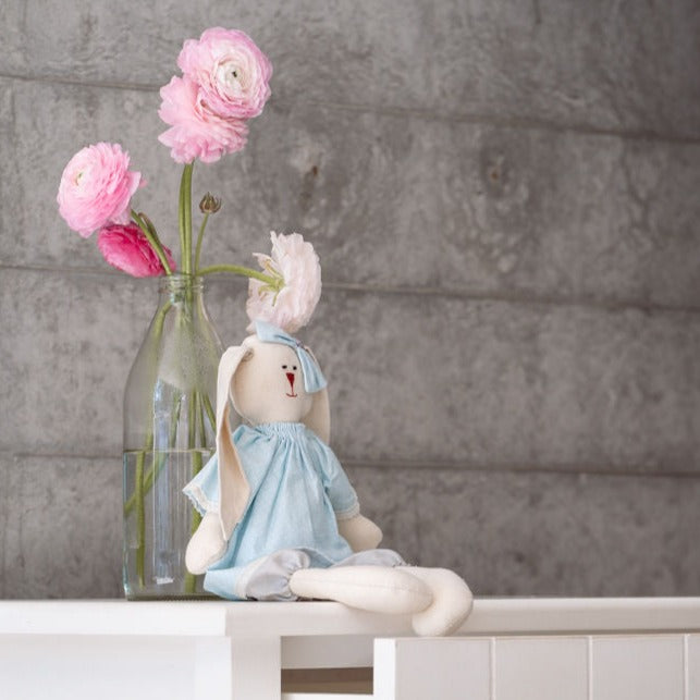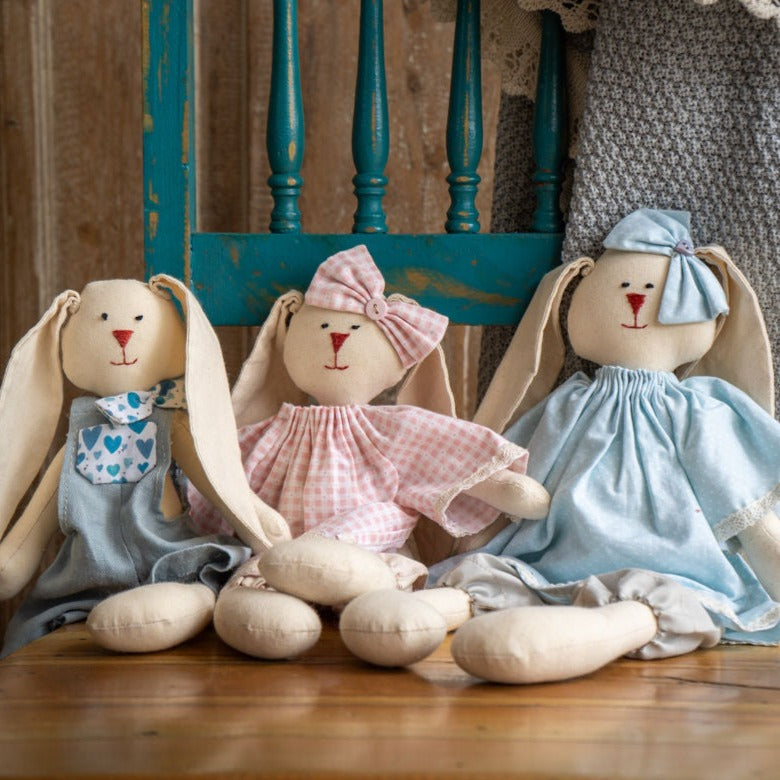 Coneja hecha a mano con mucha dedicación. Vestido celeste con puntitos blancos, con cinta en el pelo del mismo género. Perfecta como objeto de apego o para decorar en piezas, repisas, libreros, etc.