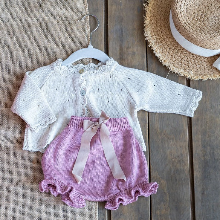 Chaleco de hilo calado rosa palo con detalles estilo crochet.
