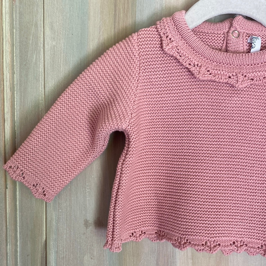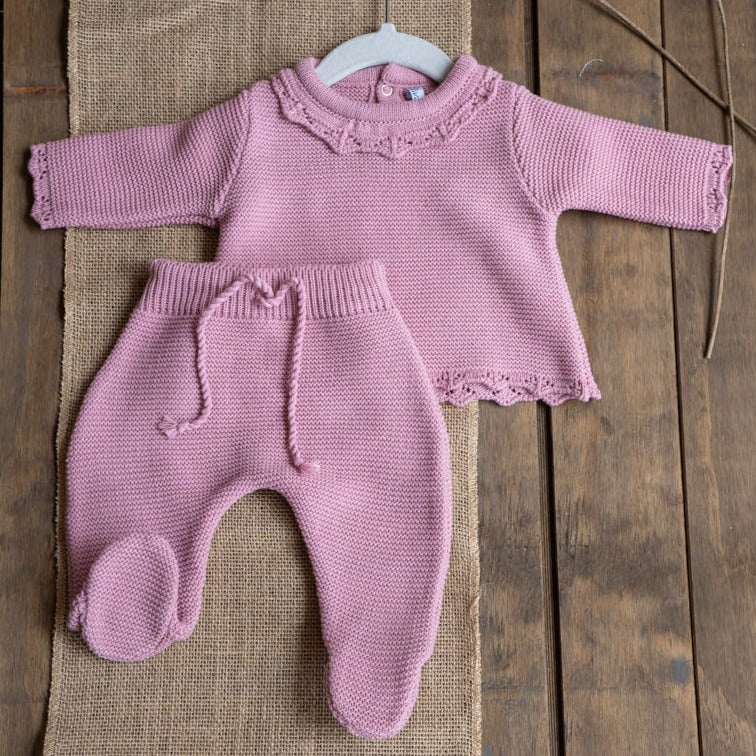 Conjunto tejido de lana algodón hipoalergénico color palo rosa. Parte de arriba con vuelos estilo crochet en en cuello. Parte de abajo pretina con amarre. Perfecto y calentito para esta temporada de otoño - invierno. Se puede lavar a máquina opción delicada (agua fría) o a mano.