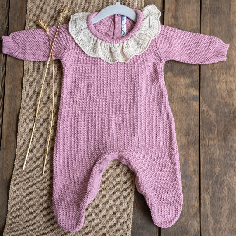 Enterito Oliva tejido suave de lana algodón hipoalergénico con detalle cuello al estilo crochet. Perfecto para todas las temporadas. Diseño y confección nacional. Se puede lavar en la lavadora con función delicada o a mano.