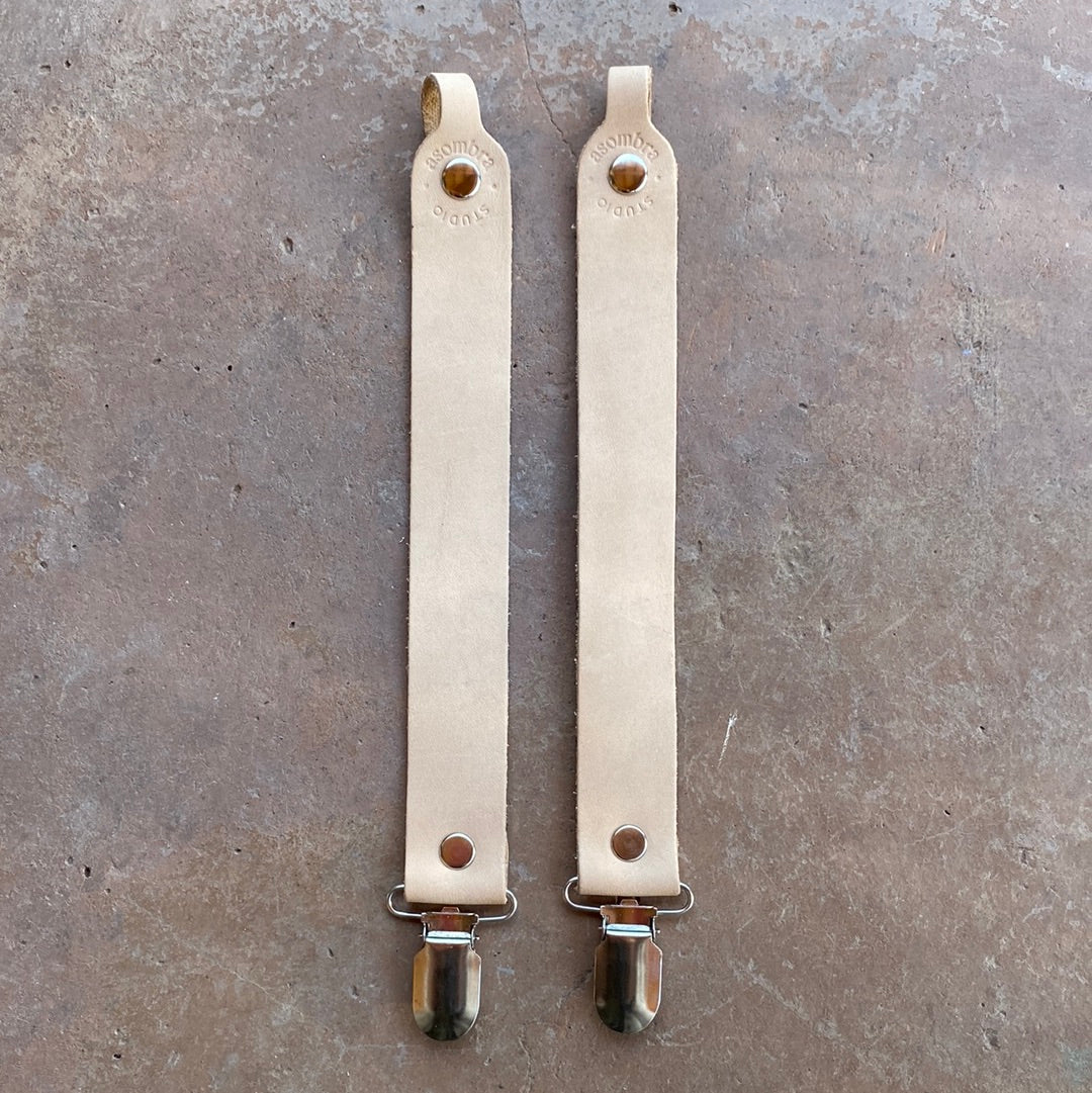 Porta chupetes de cuero con broche metálico en color beige y café. Son resistentes, elegantes y combinan con todo. ¿Que mejor? Y son hechos en Chile a mano.